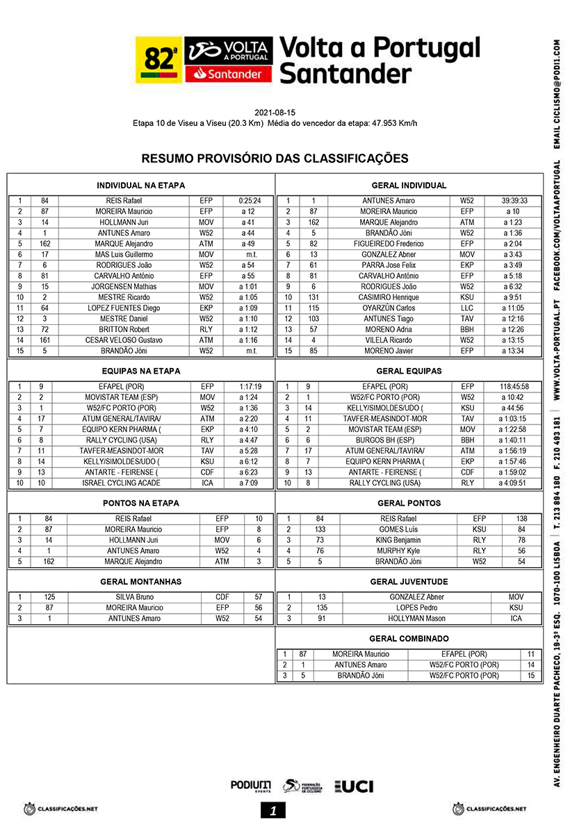 Da festa final em plena Avenida da Europa, em Viseu, com a presença de João Paulo Rebelo, secretário de Estado da juventude e do desporto, e além dos festejos azuis e brancos, é de referir também os pódios vitoriosos de Bruno Silva (Antarte-Feirense) agora definitivamente coroado Rei da Montanha com a Camisola Bolinhas Continente. Abner González, campeão de Porto Rico da Movistar, dominou por completo a classificação dos mais jovens desde a 3ª etapa e envergou a Camisola Branca Jogos Santa Casa.