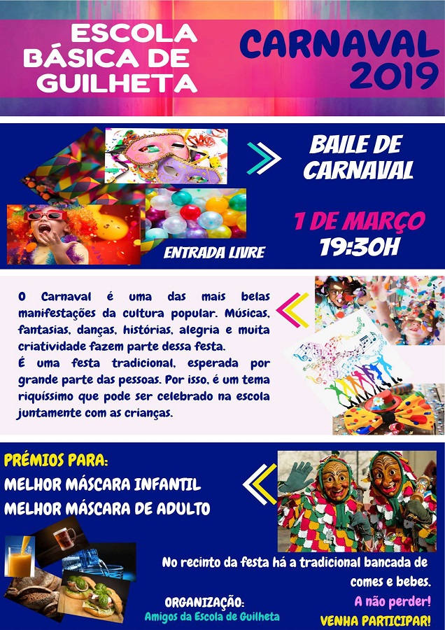 Os “Amigos da Escola de Guilheta”, de Antas, vão promover um Baile de Carnaval, no próximo dia 1 de março. A festa vai decorrer a partir das 19h30, naquele estabelecimento de ensino, tem entrada livre e é aberta à comunidade em geral. Haverá música, muita alegria e animação, para além de vários petiscos.