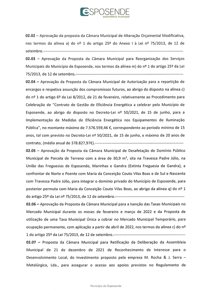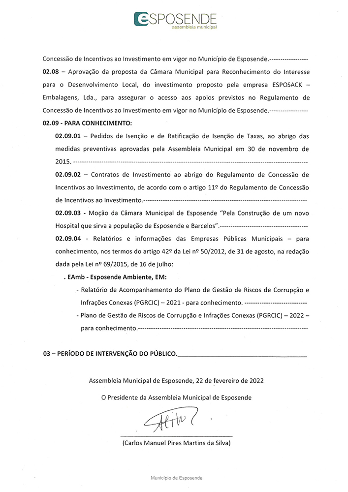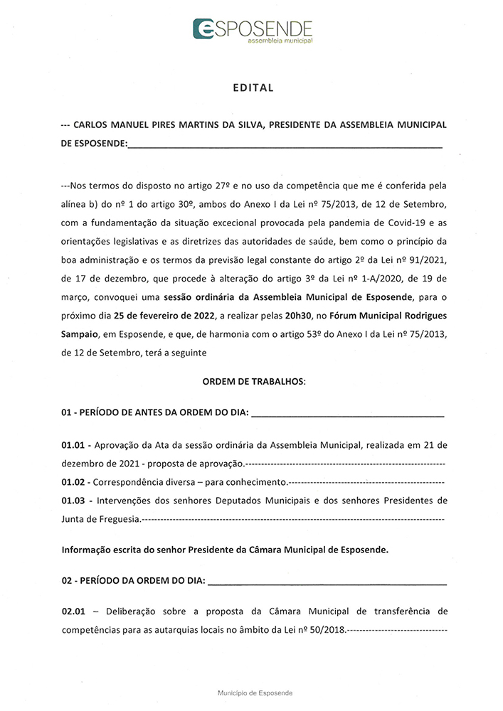 Ordem de Trabalhos da próxima sessão da Assembleia Municipal, agendada para a próxima sexta-feira, dia 25 de fevereiro, pelas 20h30, no Fórum Municipal Rodrigues Sampaio, em Esposende.
