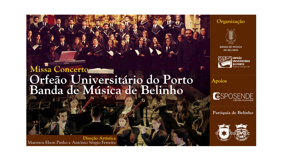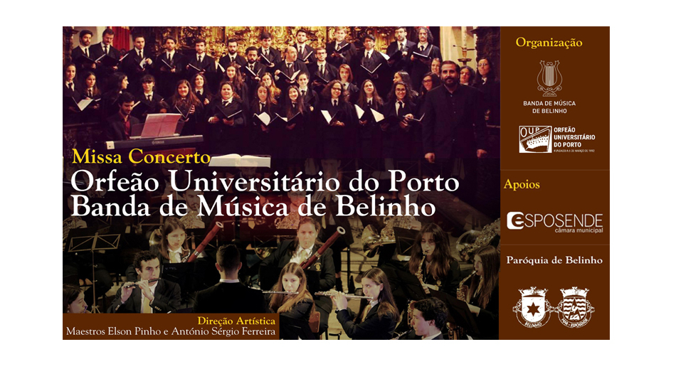 Sábado dia 19 de Novembro, pelas 19:00h, na Igreja Paroquial de Belinho, realiza-se uma Missa-Concerto pela Banda Musical de Belinho e pelo Orfeão Universitário do Porto.