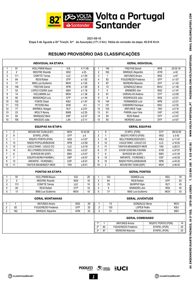 Uma fuga e eis uma reviravolta com direito a surpresa na 82ª Volta a Portugal Santander. Se o britânico vencedor, esta terça-feira, em Santo Tirso, Mason Hollyman (Israel Cycling Academy) conseguiu que mais uma escapada resultasse em êxito, Daniel Freitas aproveitou para viver o momento mais significativo da carreira: estar de amarelo na Volta. “Já tinha em mente esse objetivo na etapa da Guarda. Tentei hoje, não consegui vencer a etapa, mas vesti a amarela”, afirmou o novo líder. “A responsabilidade penso que é a mesma [agora que tem a amarela]. Temos de dar tudo todos os dias. Não vai mudar nada. Temos de ir à luta”. Freitas não escondeu que “é um dia de sonho. Depois de muitos azares este ano, foi um prémio pelo que tenho lutado e pelos azares que tenho tido”, salientou. A corrida ficou mais emocionante no dia seguinte à folga e deixou tudo ainda mais em aberto para as últimas cinco etapas.