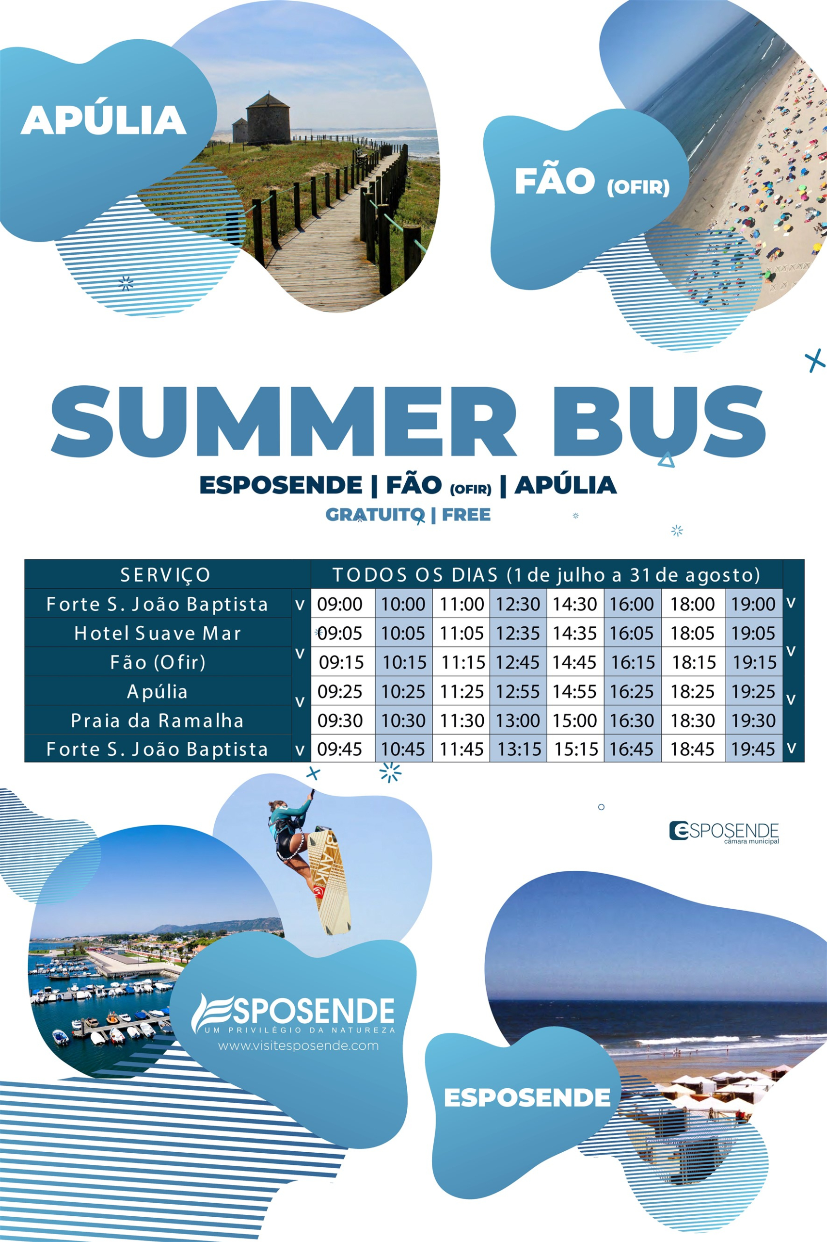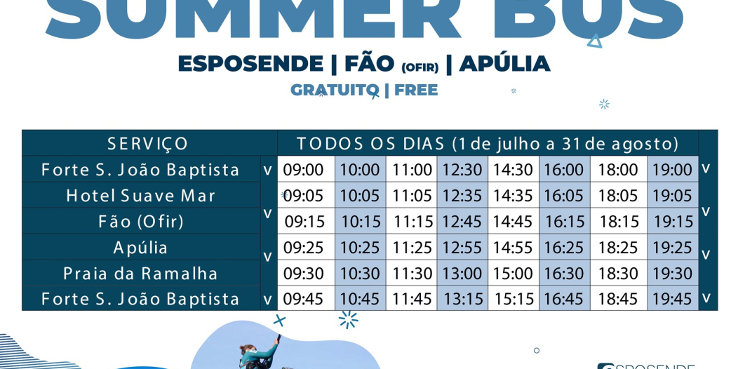 Assim, ao longo deste período, os banhistas poderão usufruir do miniautocarro “Summer Bus”, que circulará entre o Forte de S. João Baptista, junto à foz do rio Cávado, em Esposende, até à praia da Ramalha, em Apúlia, com paragem, para recolha e largada de passageiros, em Esposende (Forte São João Baptista, Hotel Suave Mar, Largo do Mercado) Fão (Ofir) e Apúlia (Praia de Cedovém, Couve e Ramalha). O transporte estará disponível diariamente, entre as 9h00 e as 19h45, com saída de Esposende às 9h00, 10h00, 11h00, 12h30, 14h30, 16h00, 18h00 e 19h00, e retorno ao ponto de partida 45 minutos após cada um destes horários.