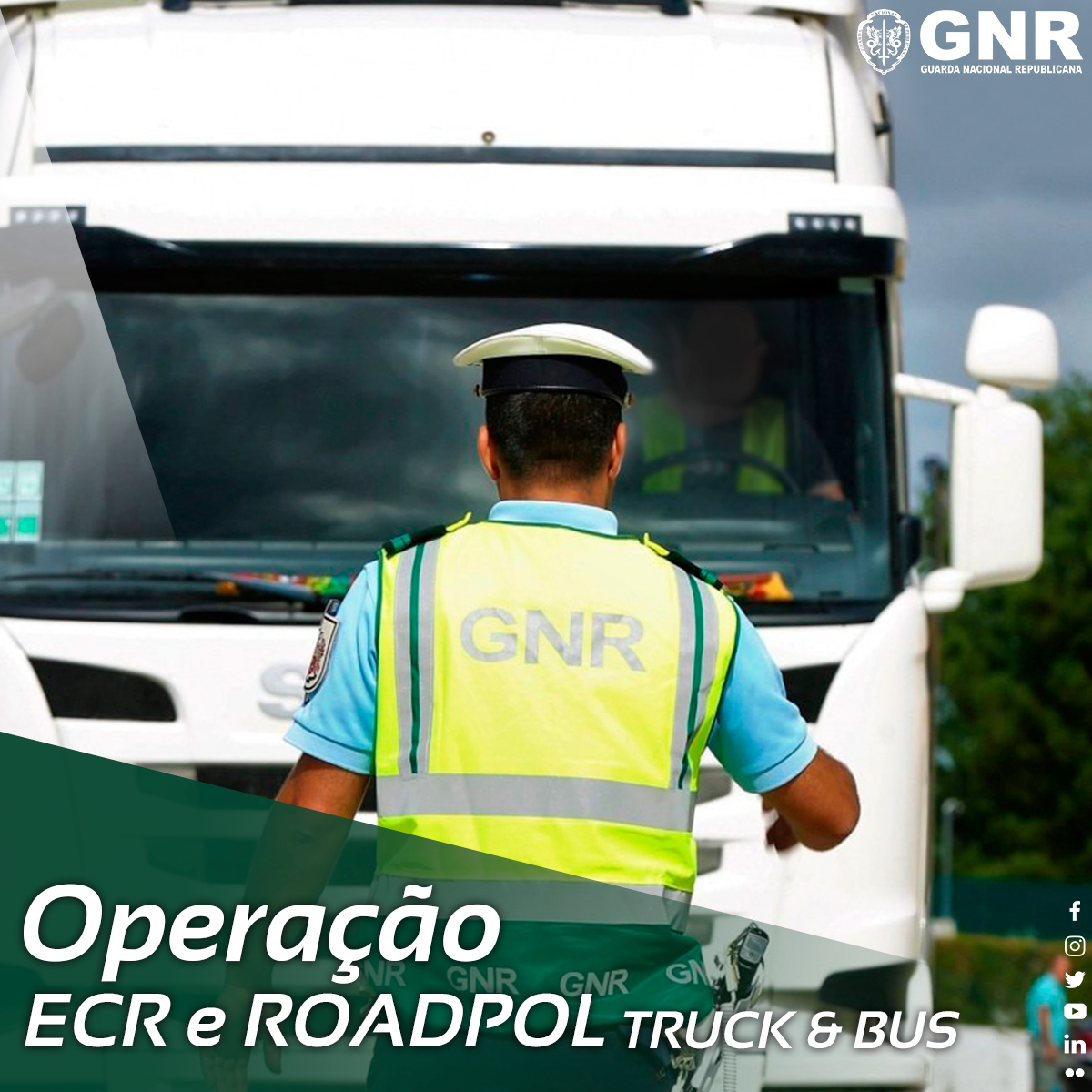 A Guarda Nacional Republicana (GNR), entre o dia 13 e o dia 19 de junho, realiza uma operação de fiscalização seletiva de transportes rodoviários de mercadorias e de passageiros, orientando as ações de fiscalização para as vias mais críticas à sua responsabilidade e onde se verifique um maior volume de tráfego deste tipo de veículos, em todo o território nacional continental.