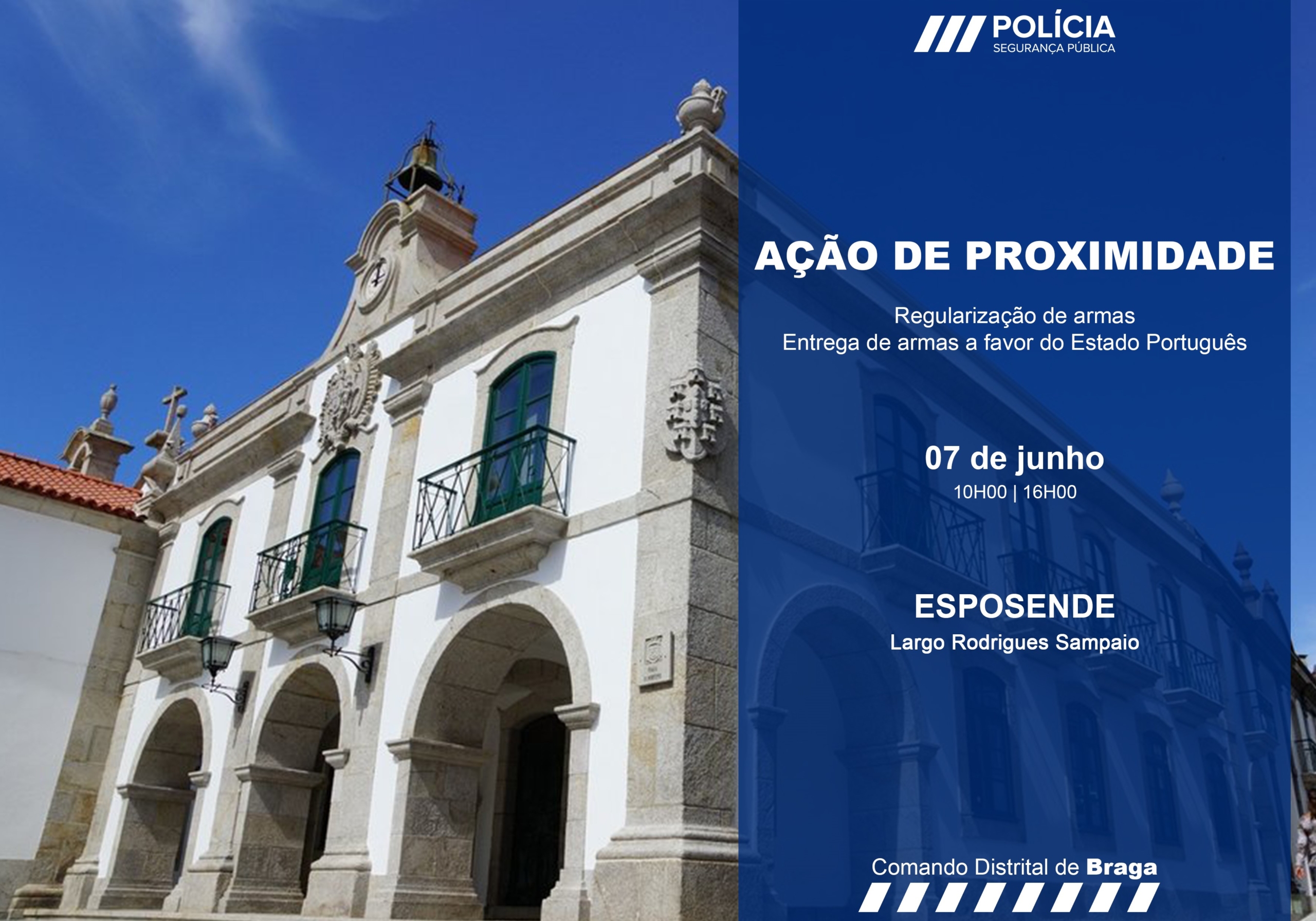 No próximo dia 7 de junho, o Comando Distrital de Braga da Polícia de Segurança Pública (PSP) vai realizar uma ação de recolha e licenciamento de armas e explosivos, em Esposende, que decorrerá entre as 10h00 e as 16h00, no Largo Rodrigues Sampaio, mais concretamente junto ao edifício do Subdestacamento de Controlo Costeiro de Esposende da GNR (antiga Guarda Fiscal).