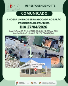 Informamos os nossos utentes que, devido a obras de remodelação na USF Esposende Norte, 𝗮 𝗽𝗮𝗿𝘁𝗶𝗿 𝗱𝗼 𝗱𝗶𝗮 𝟮𝟳 𝗱𝗲 𝗮𝗯𝗿𝗶𝗹 𝗱𝗲 𝟮𝟬𝟮𝟲 a nossa atividade passará a decorrer temporariamente no Salão Paroquial de Palmeira de Faro.