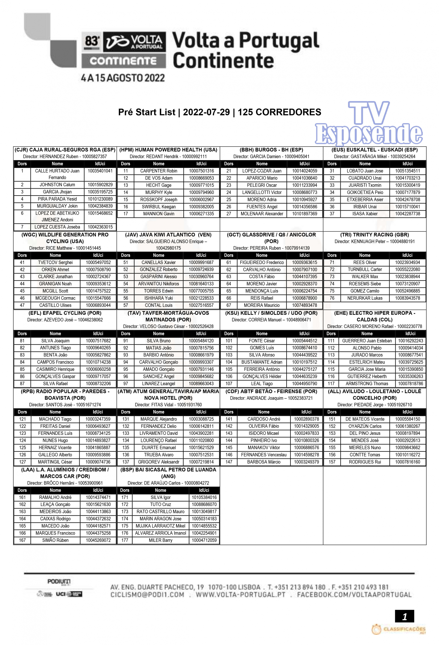 A organização da 83ª Volta a Portugal Continente informa que estão 18 equipas inscritas para a prova que se realiza entre 4 e 15 de agosto. O número de formações foi atualizado após as últimas informações recebidas da União Ciclista Internacional através da Federação Portuguesa de Ciclismo. A lista de pré inscritos contempla 125 corredores, conforme se verifica na listagem completa, em anexo.